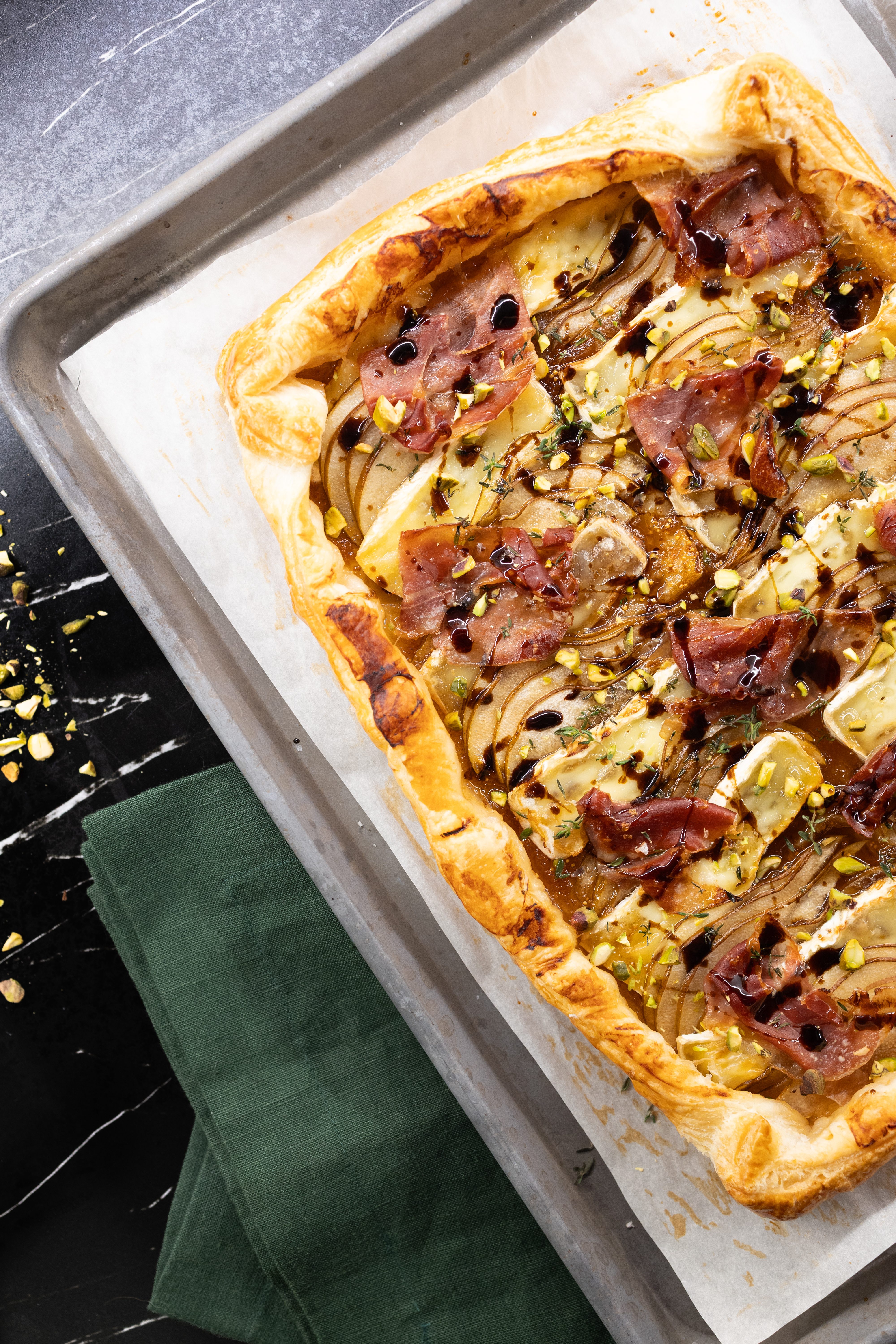 Pear, Brie, and Prosciutto Puff Pastry Tart